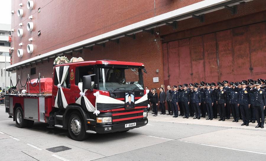 The solemn service kicked off at around 10 a.m. at the Universal Funeral Parlour in Hung Hom, Kowloon. Ho's casket was carried on a fire engine converted into a hearse, a tribute befitting his line of duty.