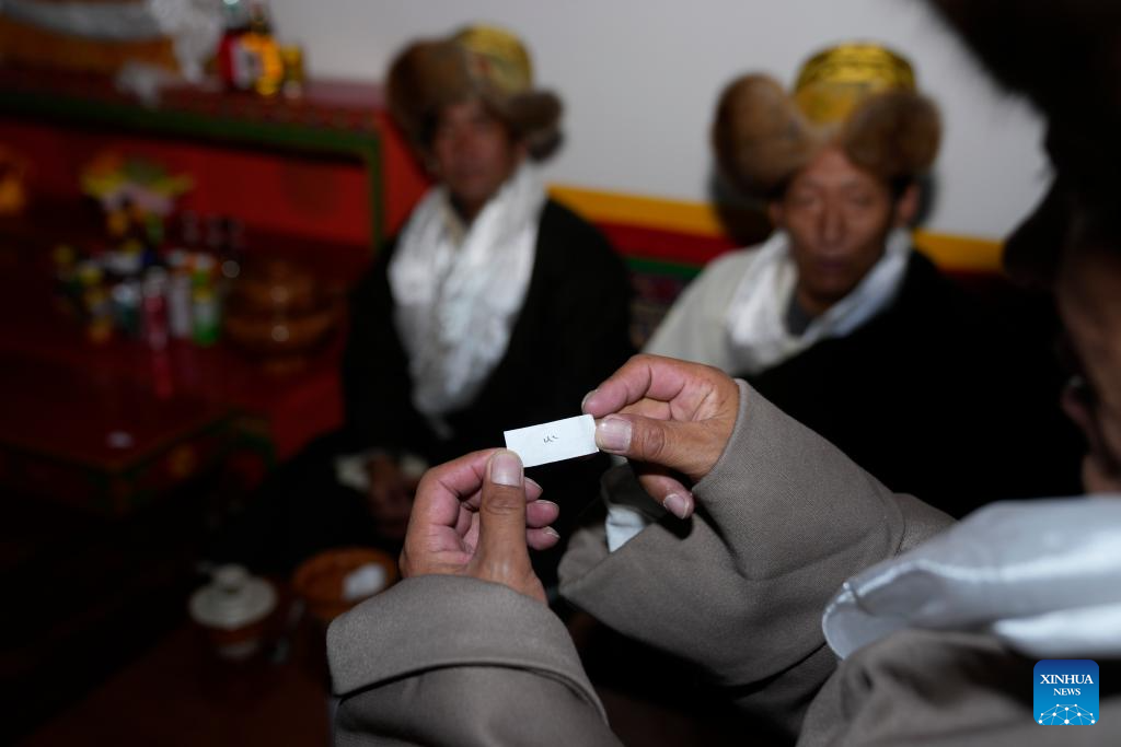 In Khorchak Village of Burang County, Jamyang Drolma's family is bustling with New Year preparations at home. A pot of "Gutu" steams on the stove, while the "chema," a two-tier rectangular wooden box containing roasted barley and fried wheat grain, is placed to pray for harvest in the next year. This year, the family rejoiced over a bumper harvest of highland barley and peas. "Life is getting better and better, and our New Year celebrations are becoming more lively each year," Jamyang Drolma said with a smile. (Xinhua/Tenzin Nyida)