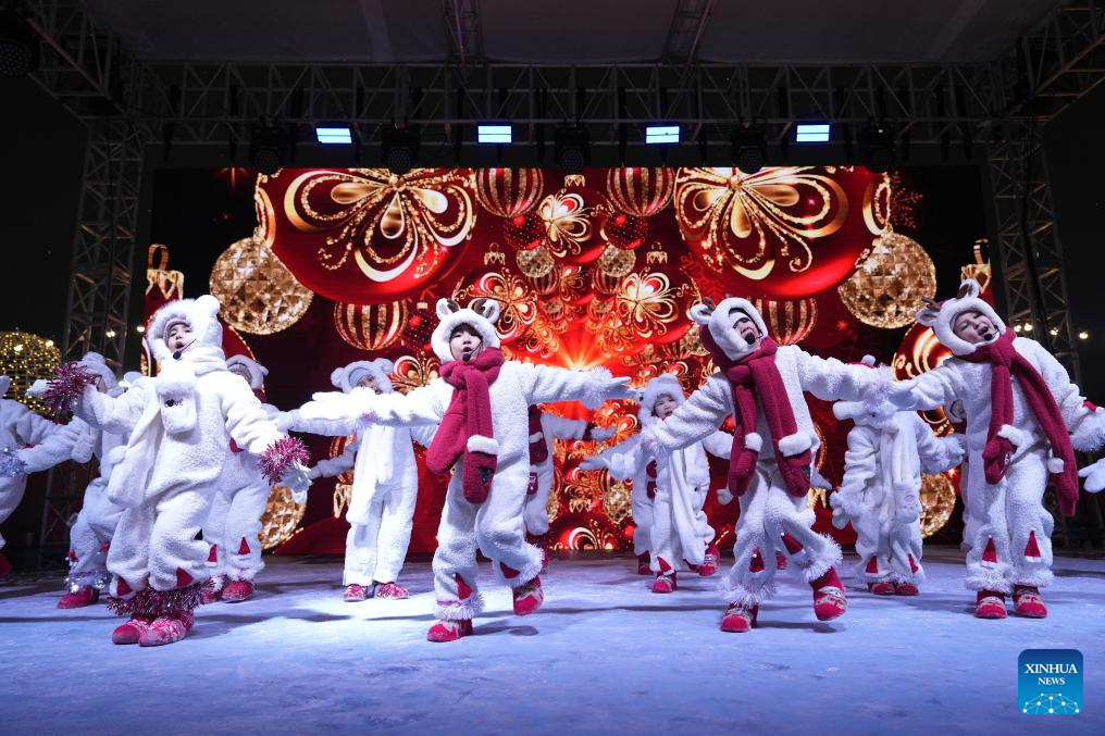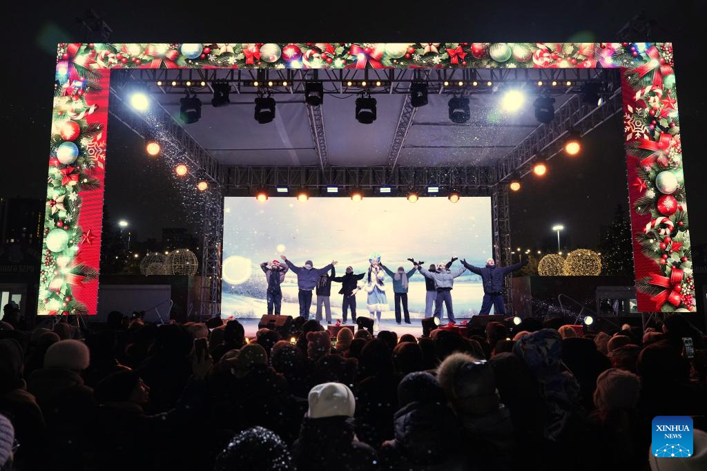 A performance is staged in Astana, Kazakhstan, Dec. 19, 2025. A New Year tree lighting ceremony was held in Astana on Friday, with more than 40 large New Year trees lit up across the city. The ceremony was accompanied by a citywide "fairy-tale fest" featuring concerts, dance performances and fireworks. (Photo by Kalizhan Ospanov/Xinhua)