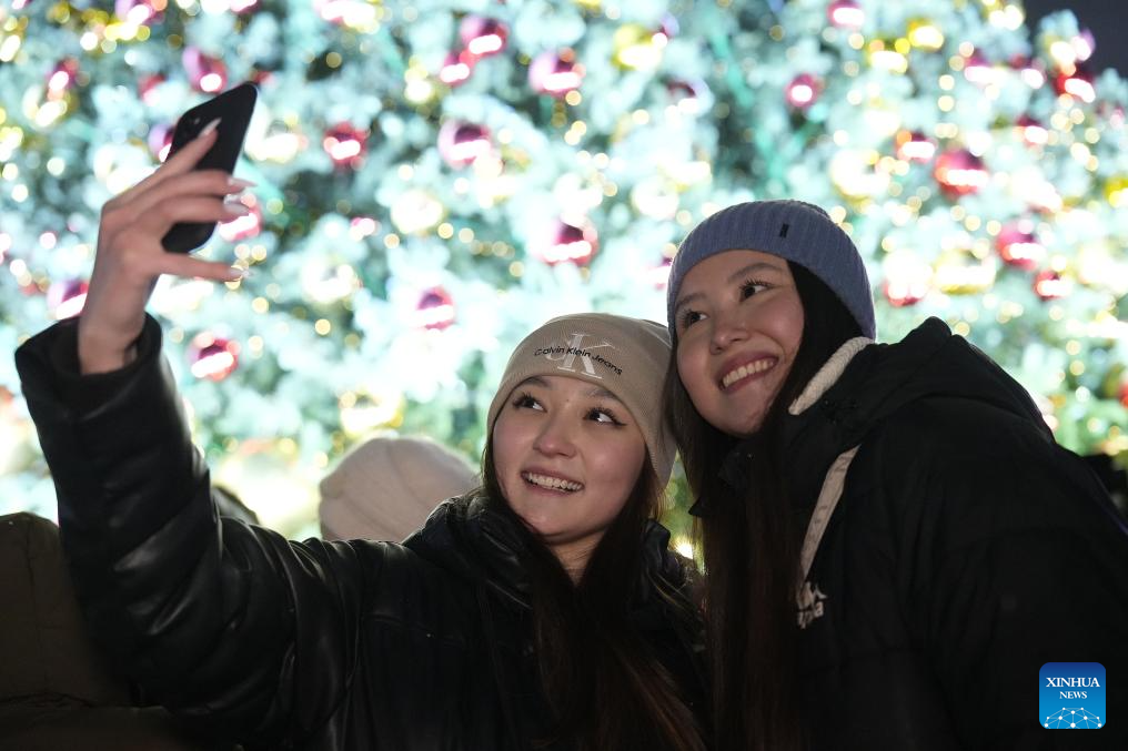 People take selfies as a New Year tree is lit up in Astana, Kazakhstan, Dec. 19, 2025. A New Year tree lighting ceremony was held in Astana on Friday, with more than 40 large New Year trees lit up across the city. The ceremony was accompanied by a citywide "fairy-tale fest" featuring concerts, dance performances and fireworks. (Photo by Kalizhan Ospanov/Xinhua)