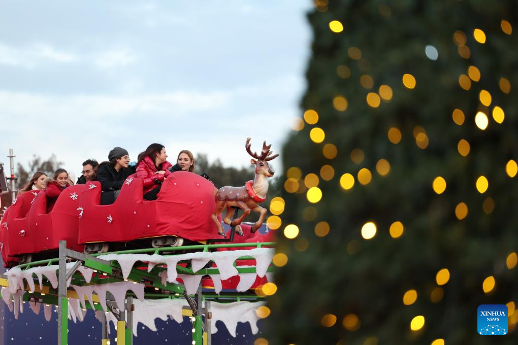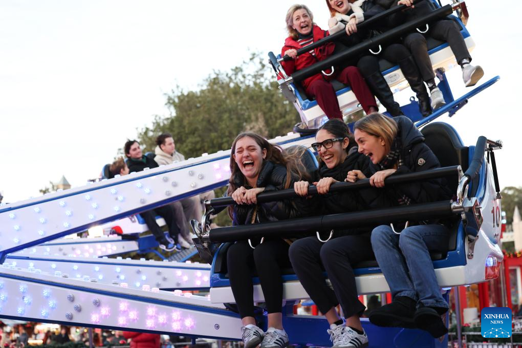People ride a spinning lift at Villa Borghese in Rome, Italy, Dec. 20, 2025. The Villa Borghese, an urban park in Rome, has been filled with festive atmosphere as the Christmas approaches. (Xinhua/Li Jing)