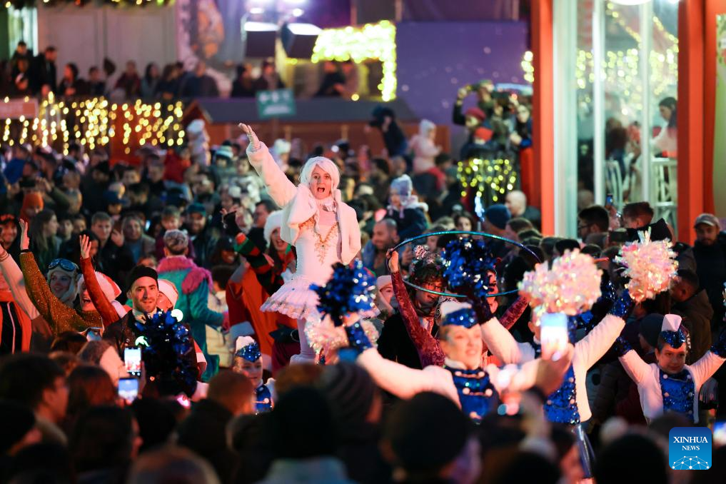 Staff members perform on a festive parade at Villa Borghese in Rome, Italy, Dec. 20, 2025. The Villa Borghese, an urban park in Rome, has been filled with festive atmosphere as the Christmas approaches. (Xinhua/Li Jing)