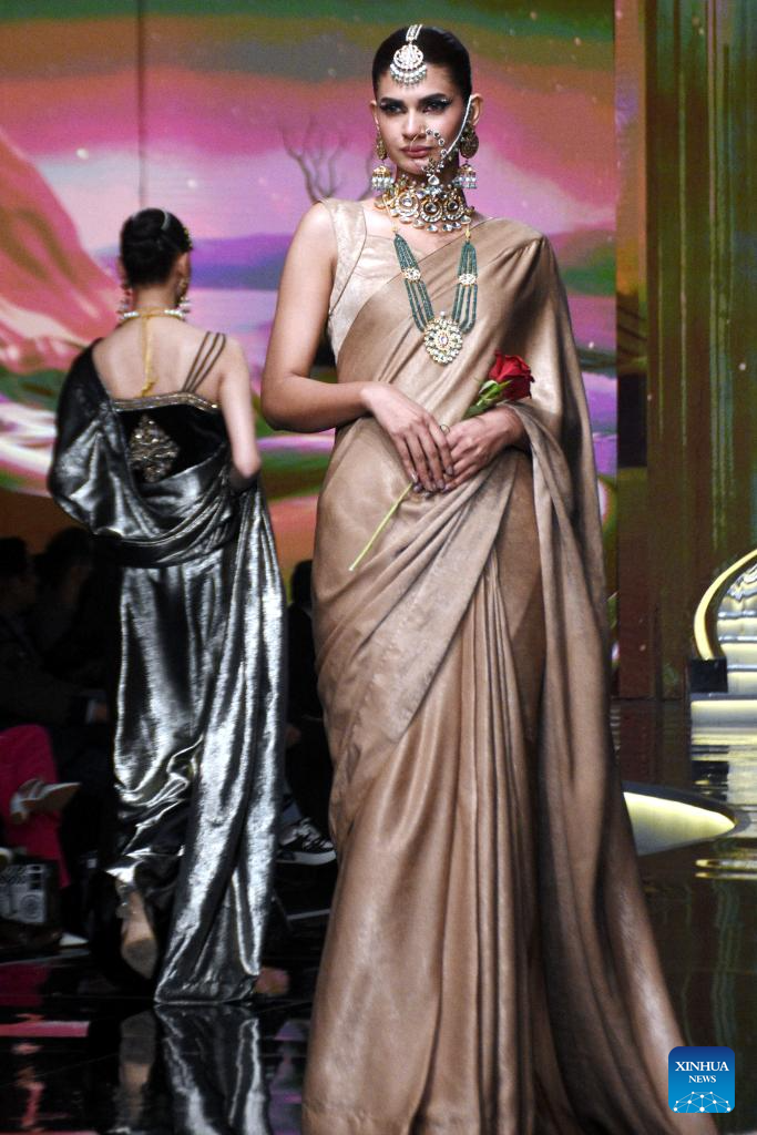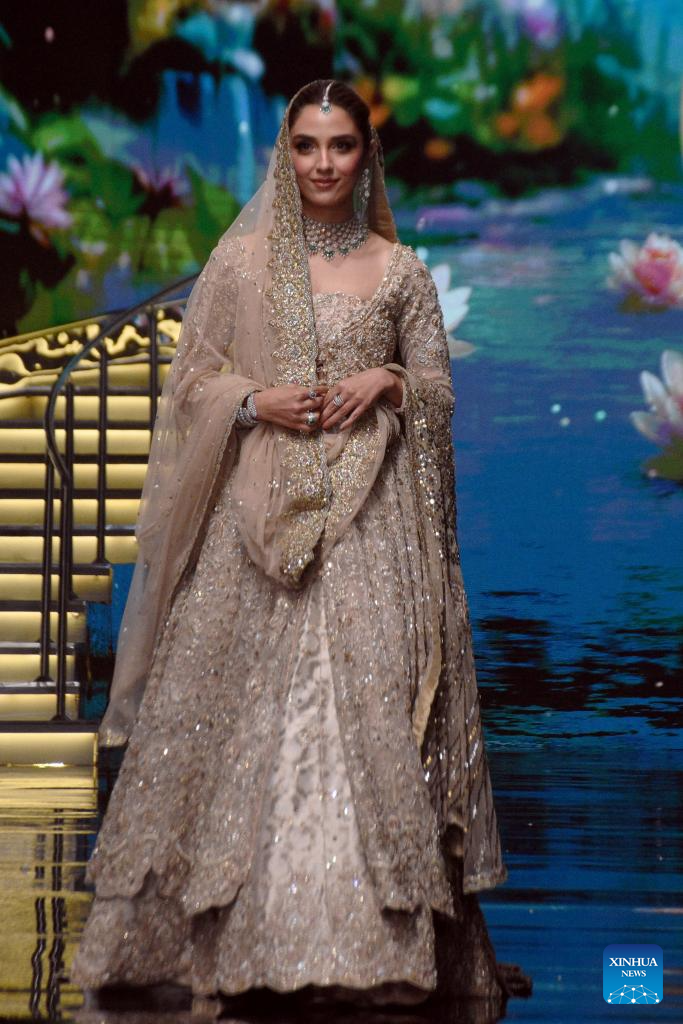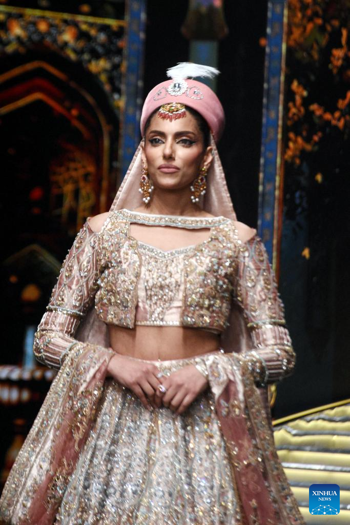 A model presents a creation during the Hum Bridal Couture Week fashion show in Lahore, Pakistan on Dec. 20, 2025. (Photo by Sajjad/Xinhua)