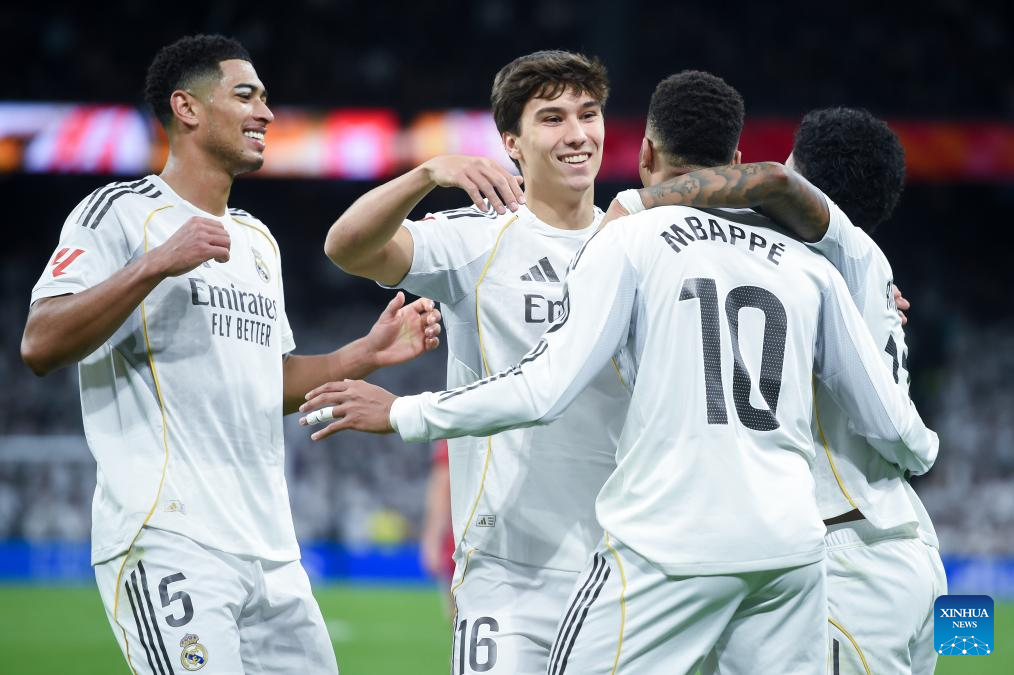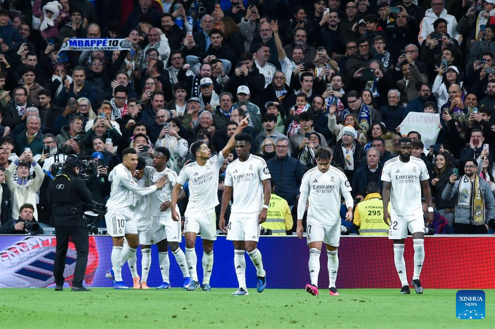 Players of Real Madrid celebrate a goal during a La Liga football match between Real Madrid and Sevilla FC at Santiago Bernabeu stadium in Madrid, Spain, on Dec. 20, 2025. (Photo by Gustavo Valiente/Xinhua)