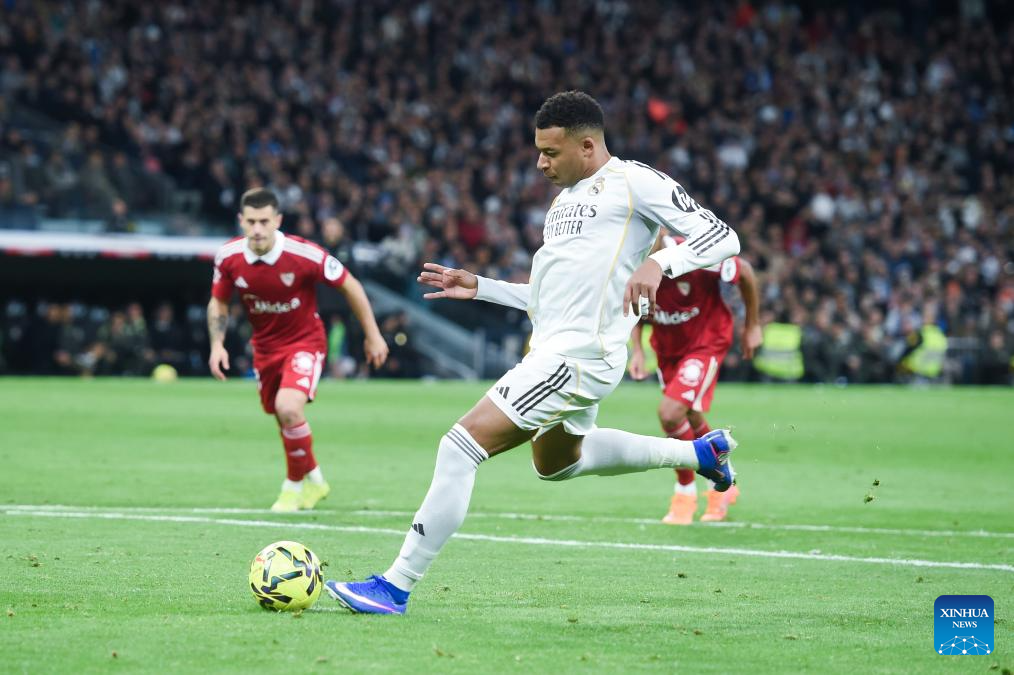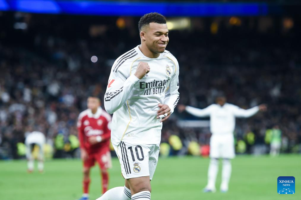 Real Madrid's Kylian Mbappe celebrates a goal during a La Liga football match between Real Madrid and Sevilla FC at Santiago Bernabeu stadium in Madrid, Spain, on Dec. 20, 2025. (Photo by Gustavo Valiente/Xinhua)