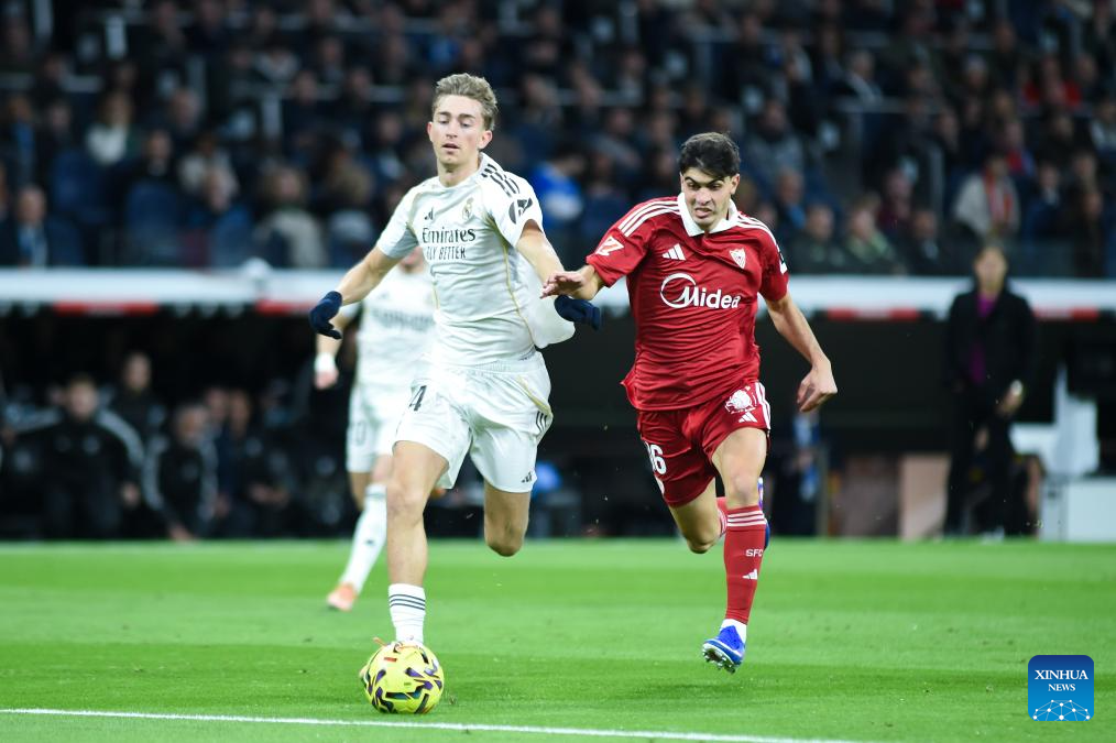 Real Madrid's Dean Huijsen (L) vies with Sevilla FC's Juanlu Sanchez during a La Liga football match between Real Madrid and Sevilla FC at Santiago Bernabeu stadium in Madrid, Spain, on Dec. 20, 2025. (Photo by Gustavo Valiente/Xinhua)