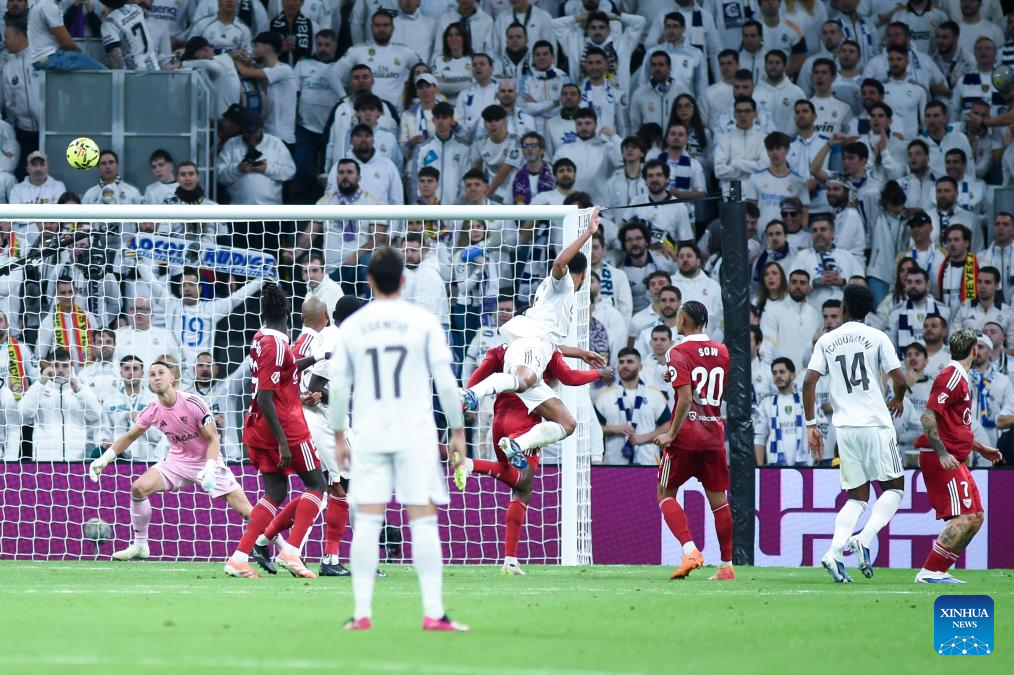 Real Madrid's Jude Bellingham (4th R) scores during a La Liga football match between Real Madrid and Sevilla FC at Santiago Bernabeu stadium in Madrid, Spain, on Dec. 20, 2025. (Photo by Gustavo Valiente/Xinhua)