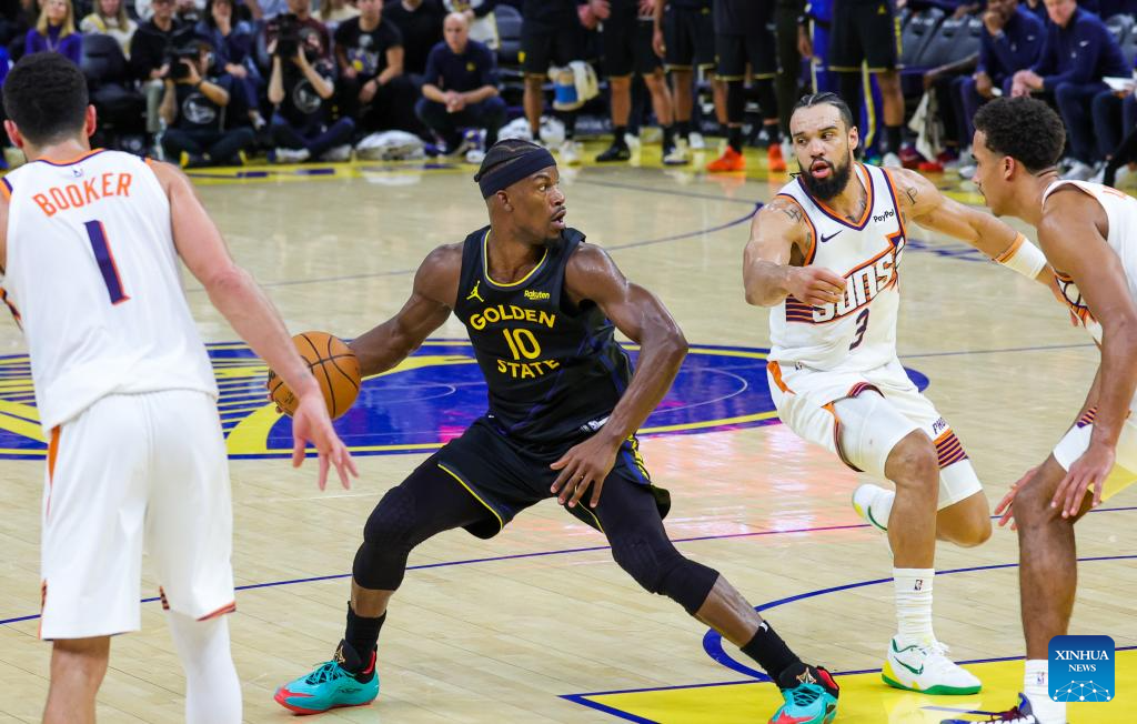 Jimmy Butler (2nd L) of Golden State Warriors competes during the 2025-2026 NBA regular season game between Golden State Warriors and Phoenix Suns in San Francisco, the United States, Dec. 20, 2025. (Photo by Dong Xudong/Xinhua)