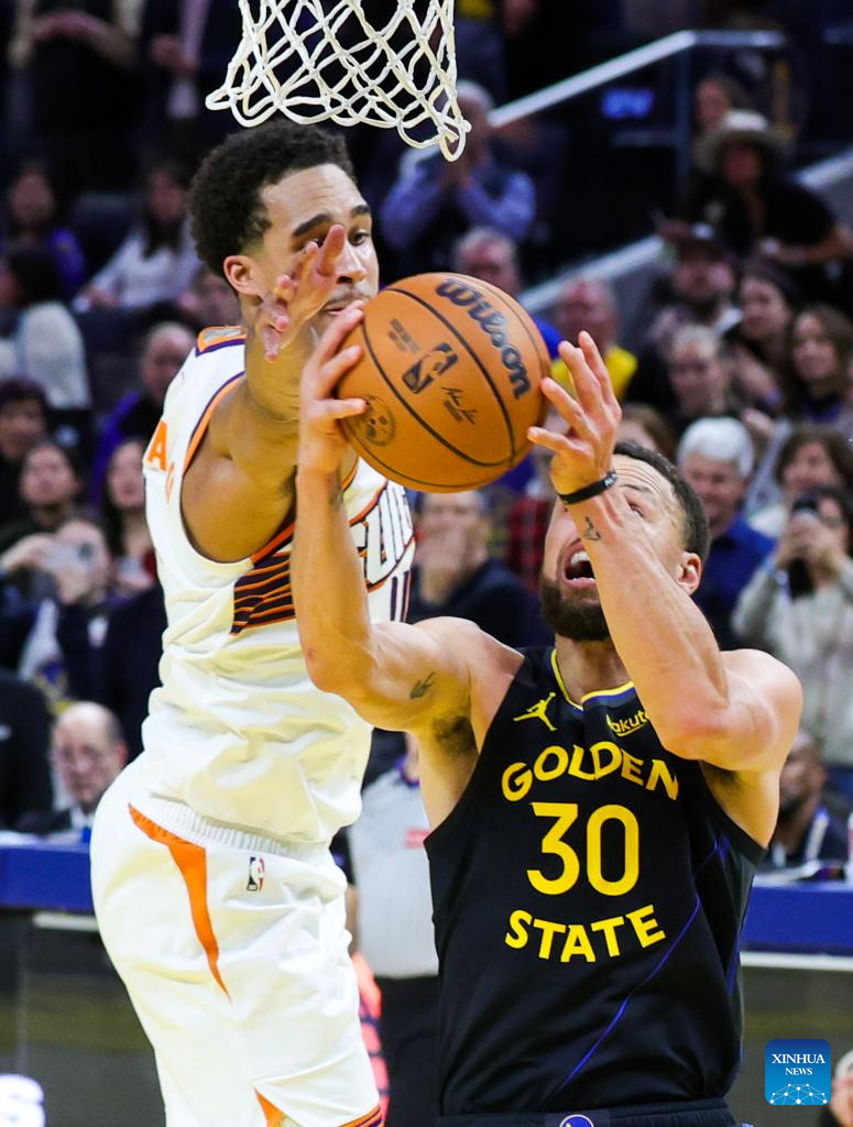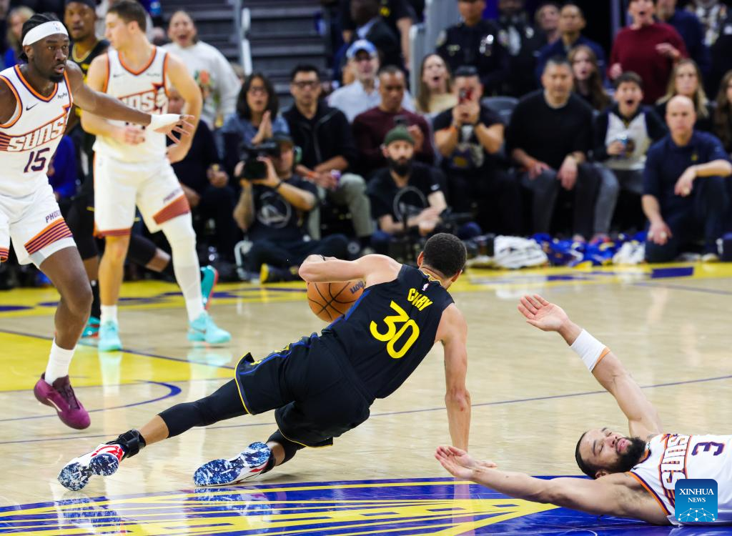 Stephen Curry (2nd R) of Golden State Warriors competes during the 2025-2026 NBA regular season game between Golden State Warriors and Phoenix Suns in San Francisco, the United States, Dec. 20, 2025. (Photo by Dong Xudong/Xinhua)