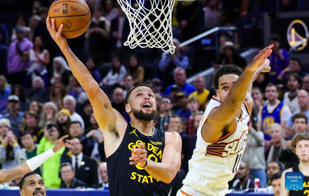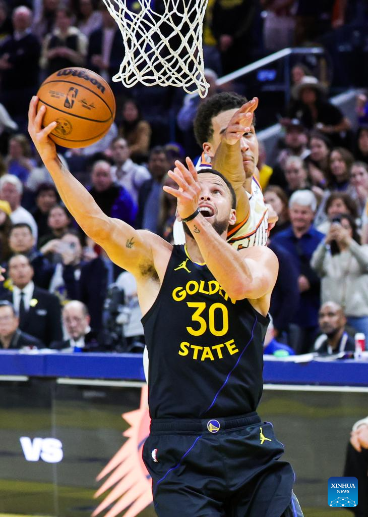 Stephen Curry (R) of Golden State Warriors goes for a layup during the 2025-2026 NBA regular season game between Golden State Warriors and Phoenix Suns in San Francisco, the United States, Dec. 20, 2025. (Photo by Dong Xudong/Xinhua)