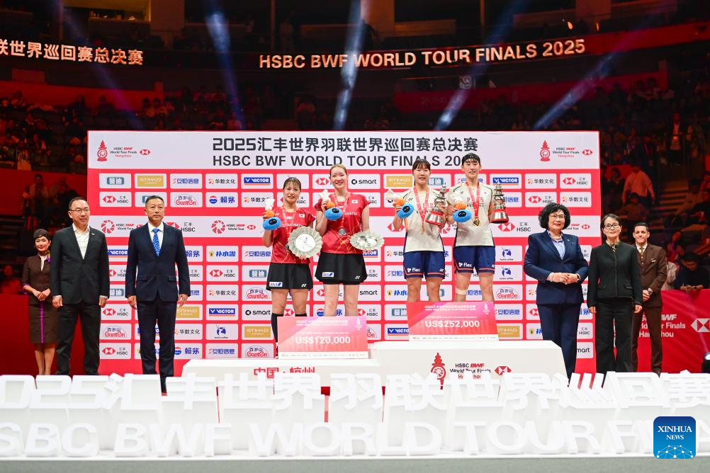 Baek Ha Na (below R)/Lee So Hee (top R) of South Korea and Fukushima Yuki (below L)/Matsumoto Mayu of Japan pose on the podium during the awarding ceremony after the women's doubles final at BWF World Tour Finals 2025 in Hangzhou, east China's Zhejiang Province, Dec. 21, 2025. (Xinhua/Jiang Han)