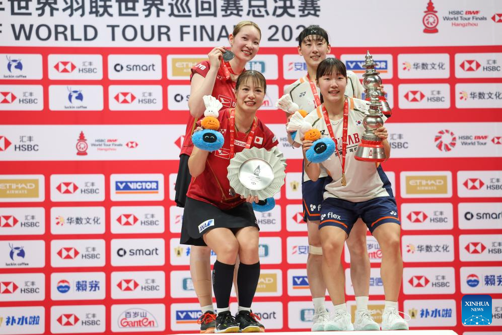 Baek Ha Na/Lee So Hee (L) of South Korea pose on the podium during the awarding ceremony after the women's doubles final between Baek Ha Na/Lee So Hee of South Korea and Fukushima Yuki/Matsumoto Mayu of Japan at BWF World Tour Finals 2025 in Hangzhou, east China's Zhejiang Province, Dec. 21, 2025. (Xinhua/Jiang Han)