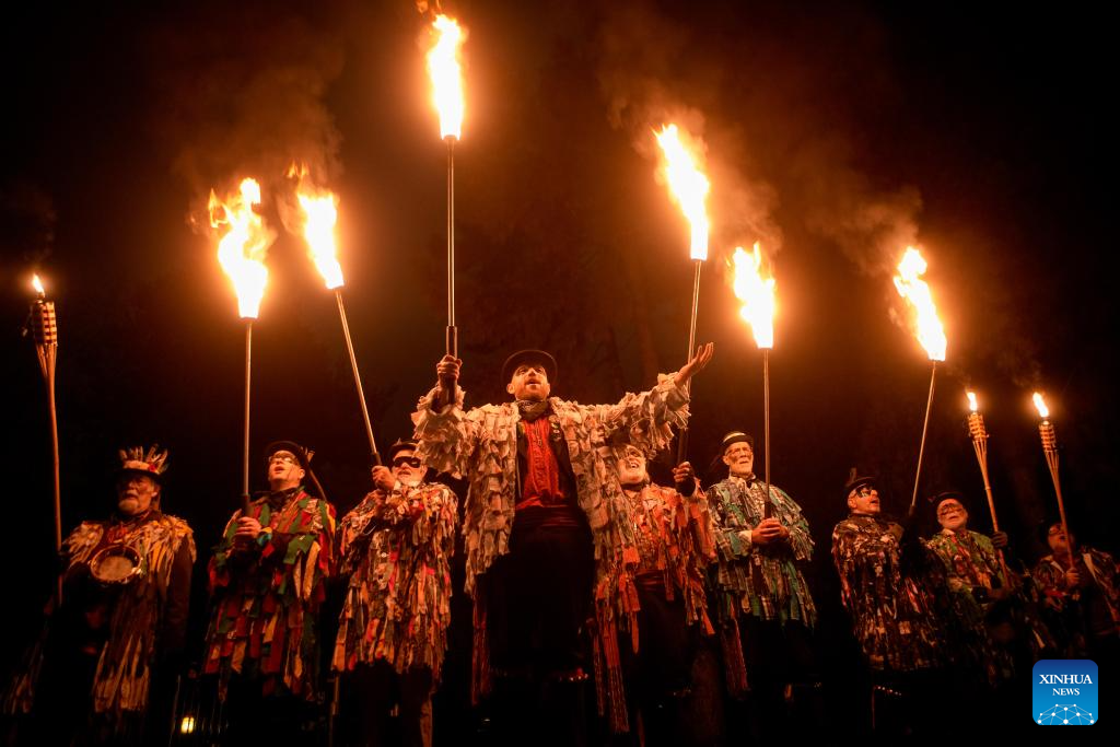 Performers holding fire torches sing during the Winter Solstice Lantern Festival in Vancouver, British Columbia, Canada, Dec. 21, 2025. Singing performances, lantern parades and dance activities were held here on Sunday to celebrate the Winter Solstice, which fell on Dec. 21 this year. (Photo by Liang Sen/Xinhua)