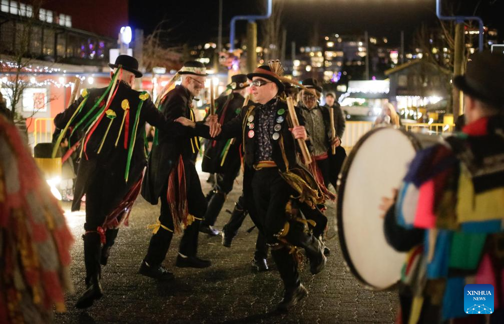 Dancers perform Morris, a traditional English folk dance, during the Winter Solstice Lantern Festival in Vancouver, British Columbia, Canada, Dec. 21, 2025. Singing performances, lantern parades and dance activities were held here on Sunday to celebrate the Winter Solstice, which fell on Dec. 21 this year. (Photo by Liang Sen/Xinhua)