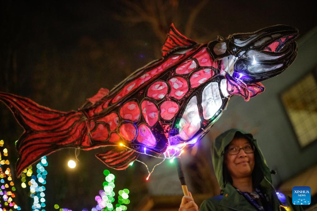 A woman holding a fish-shaped lantern is pictured during the Winter Solstice Lantern Festival in Vancouver, British Columbia, Canada, Dec. 21, 2025. Singing performances, lantern parades and dance activities were held here on Sunday to celebrate the Winter Solstice, which fell on Dec. 21 this year. (Photo by Liang Sen/Xinhua)