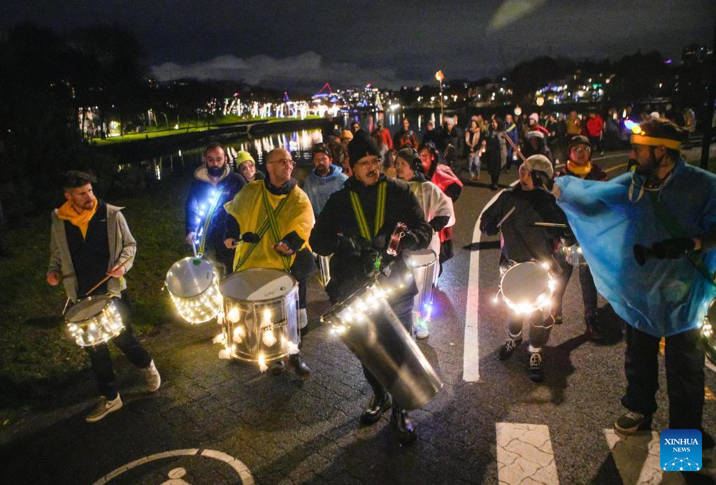 People holding lanterns participate in the Winter Solstice Lantern Festival in Vancouver, British Columbia, Canada, Dec. 21, 2025. Singing performances, lantern parades and dance activities were held here on Sunday to celebrate the Winter Solstice, which fell on Dec. 21 this year. (Photo by Liang Sen/Xinhua)