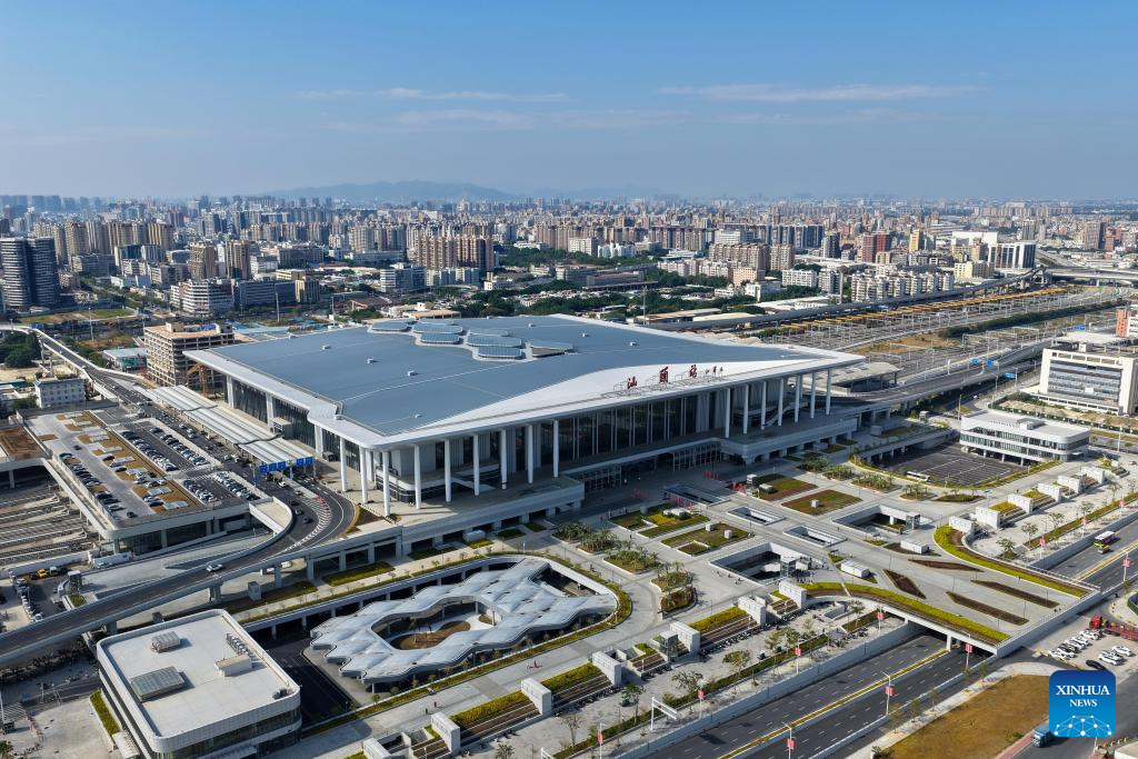 An aerial drone photo taken on Dec. 22, 2025 shows the Shantou railway station in Shantou City, south China's Guangdong Province. The Shantou-Shantou South section of the 162-km-long Shantou-Shanwei high-speed railway was completed and opened to traffic on Monday, marking the full-line operation of the railway. (Photo by Yao Jun/Xinhua)