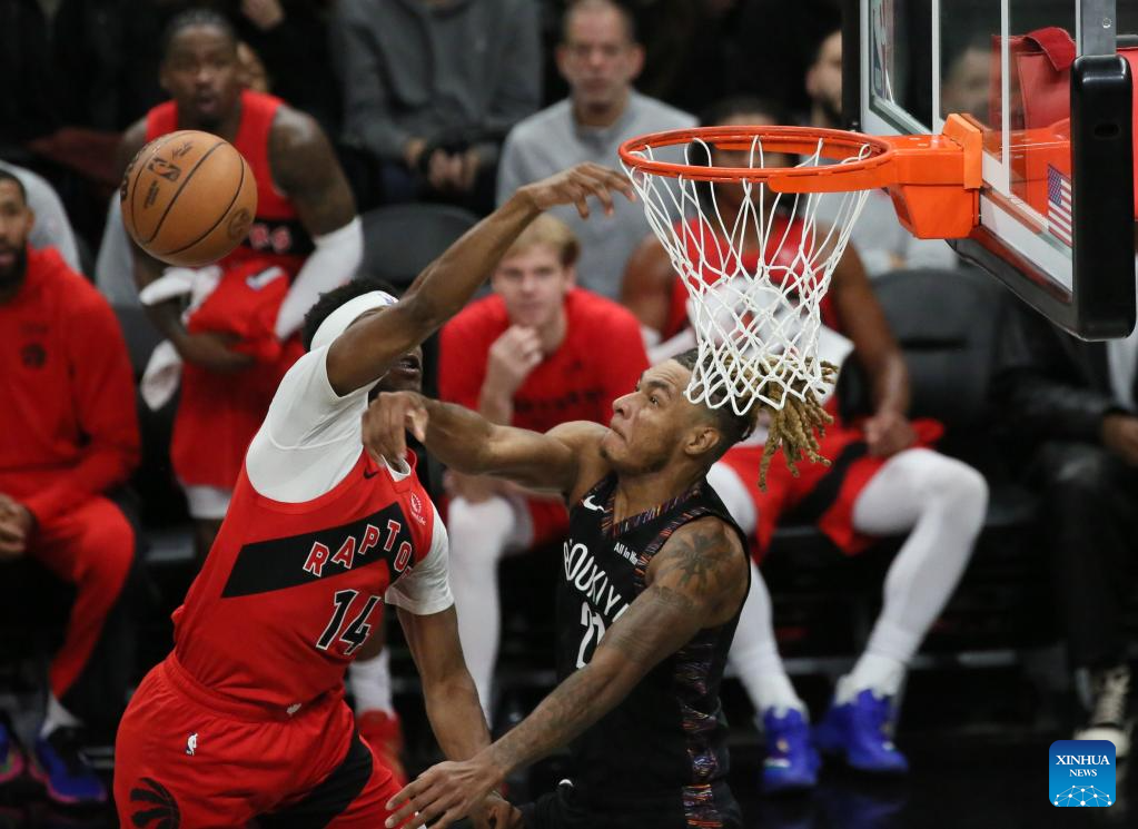 Collin Murray-Boyles (R) of Toronto Raptors competes during the 2025-2026 NBA regular season game between Brooklyn Nets and Toronto Raptors in New York, the United States, Dec. 21, 2025. (Xinhua/Zhang Fengguo)