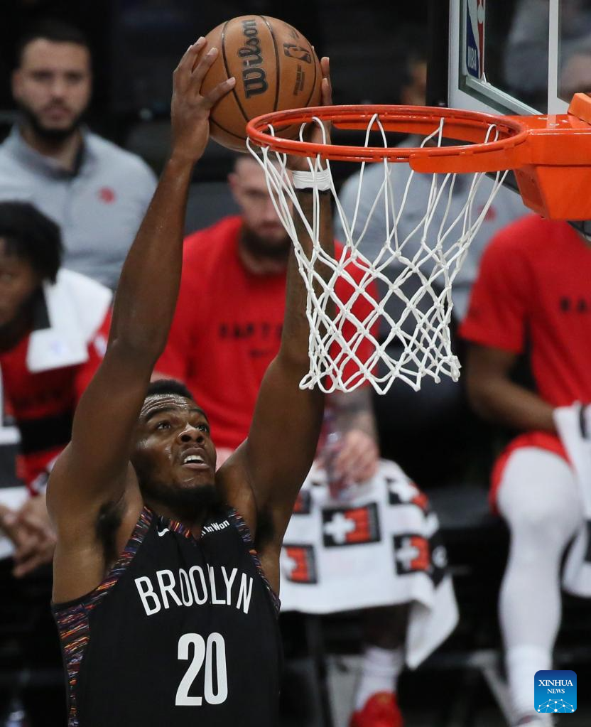 Day'Ron Sharpe of Brooklyn Nets goes for the basket during the 2025-2026 NBA regular season game between Brooklyn Nets and Toronto Raptors in New York, the United States, Dec. 21, 2025. (Xinhua/Zhang Fengguo)
