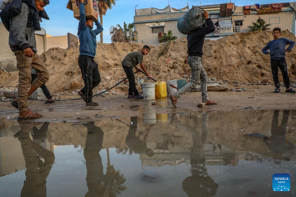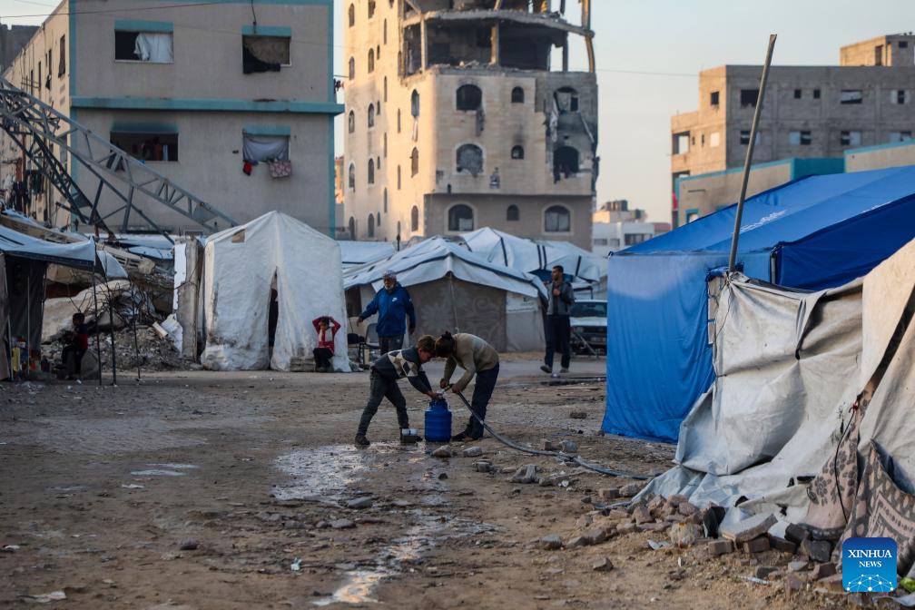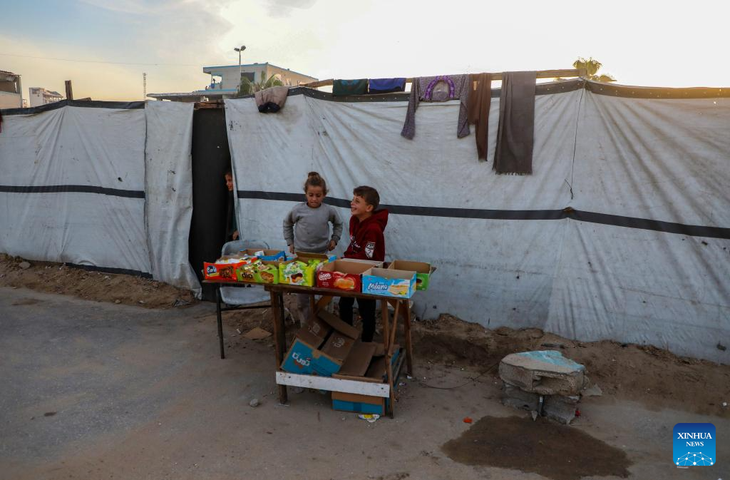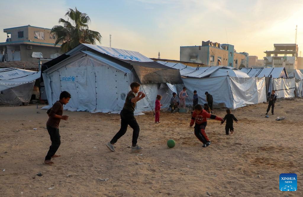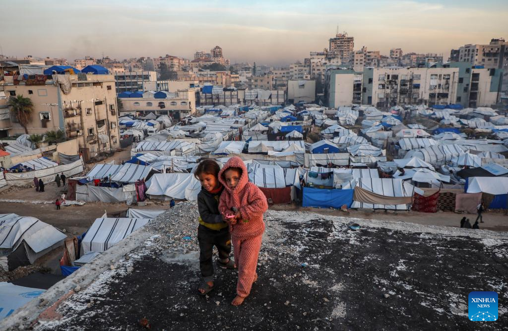 Displaced Palestinian children are seen at a temporary shelter in west of Gaza City, on Dec. 22, 2025. (Photo by Rizek Abdeljawad/Xinhua)
