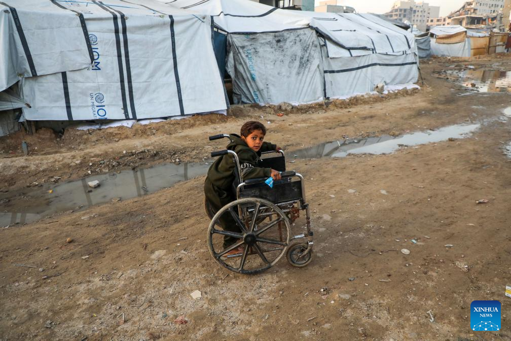 A displaced Palestinian child is seen at a temporary shelter in west of Gaza City, on Dec. 22, 2025. (Photo by Rizek Abdeljawad/Xinhua)