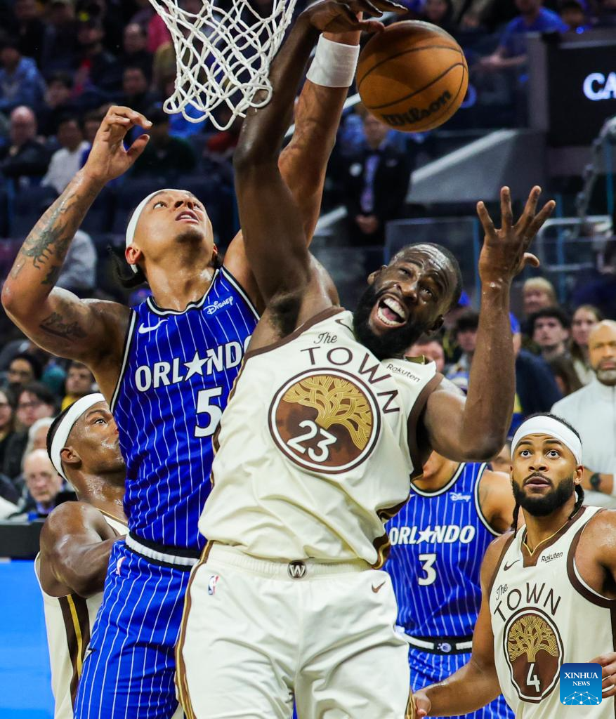 Jimmy Butler III (top) of Golden State Warriors dunks during the 2025-2026 NBA regular season game between Golden State Warriors and Orlando Magic in San Francisco, the United States, Dec. 22, 2025. (Photo by Arthur Dong/Xinhua)