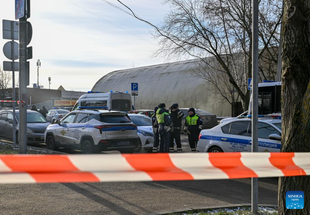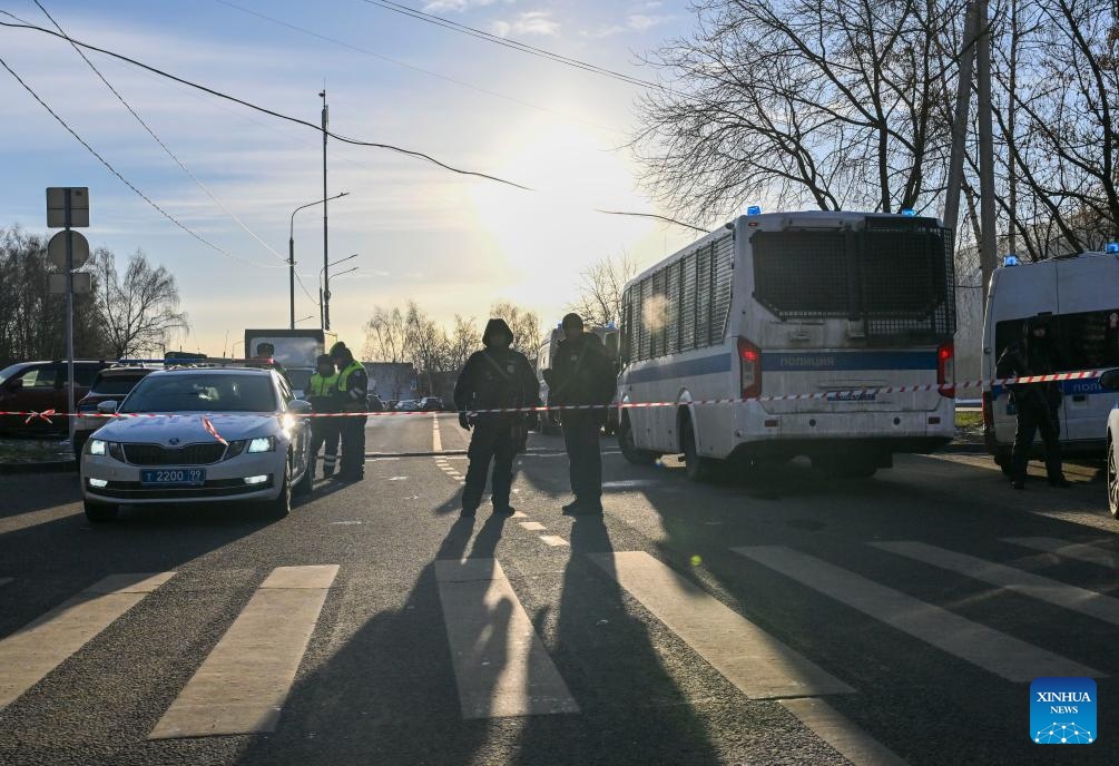 Police are seen at the explosion site in southern Moscow, Russia, Dec. 24, 2025. An explosion in southern Moscow killed three people, including two traffic police officers, on Wednesday, the Russian Investigative Committee reported. (Xinhua/Hao Jianwei)
