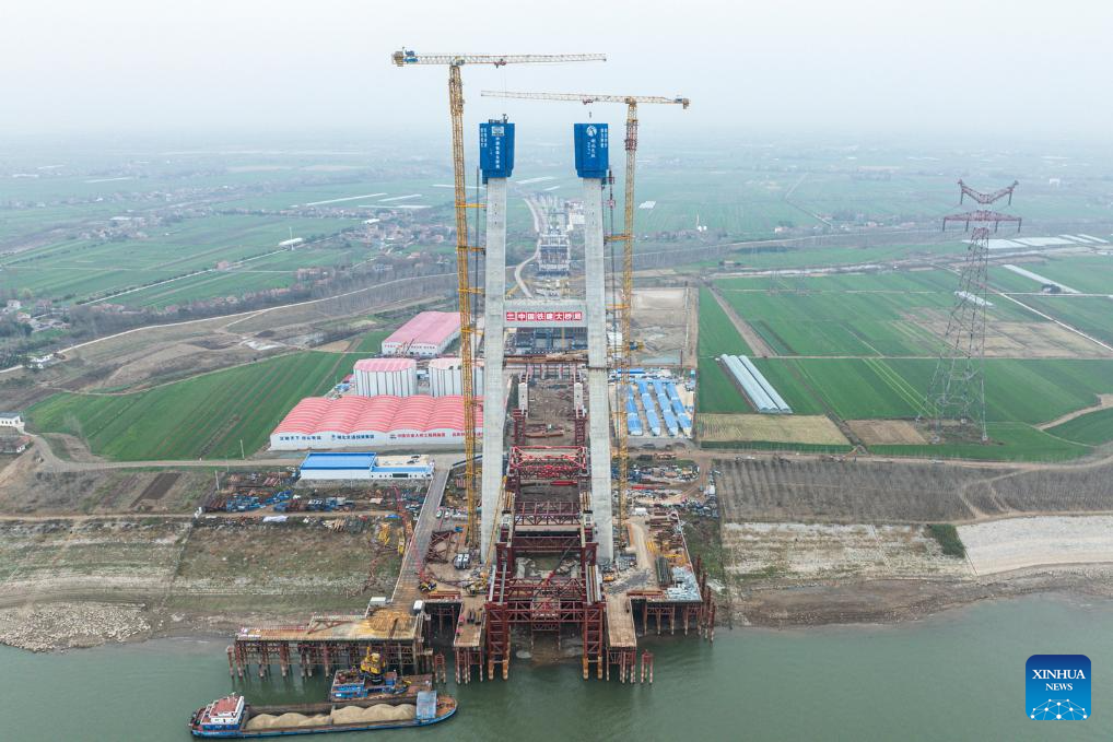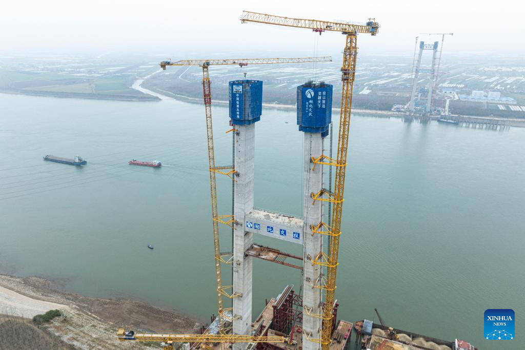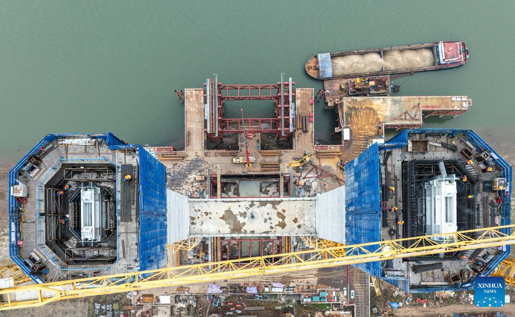 An aerial drone photo taken on Dec. 24, 2025 shows the south tower construction site of Libu Yangtze River road-rail bridge project in Jingzhou, central China's Hubei Province. With a main span of 1,120 meters, the Libu Yangtze River road-rail bridge will further improve traffic network of the Yangtze River Economic Belt after completion. (Xinhua/Wu Zhizun)