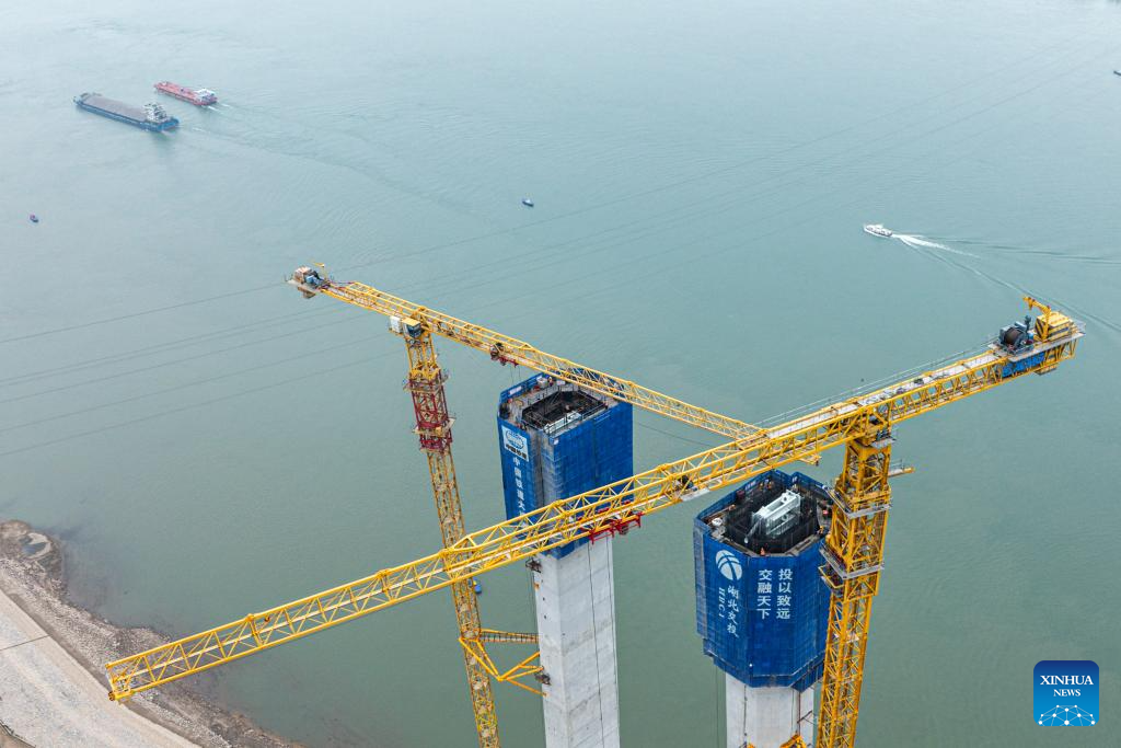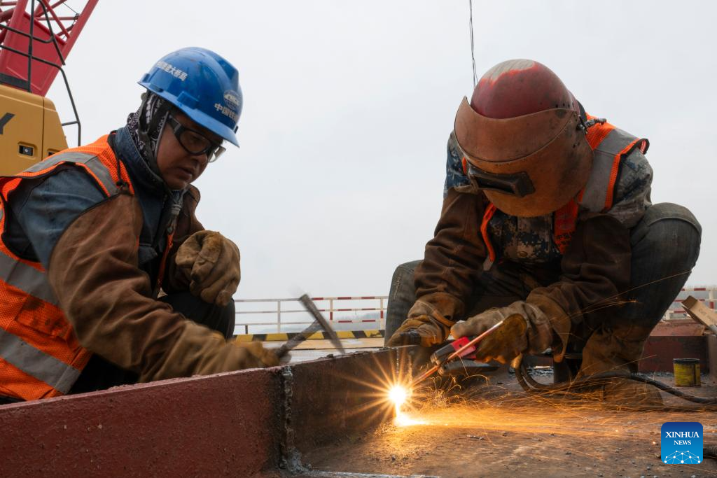 Workers are pictured at the south tower construction site of Libu Yangtze River road-rail bridge project in Jingzhou, central China's Hubei Province, Dec. 24, 2025. With a main span of 1,120 meters, the Libu Yangtze River road-rail bridge will further improve traffic network of the Yangtze River Economic Belt after completion. (Xinhua/Wu Zhizun)