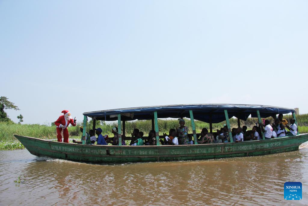 People take part in a Christmas-themed event held in Ganvie water village, near Cotonou, Benin, Dec. 23, 2025. (Photo by Seraphin Zounyekpe/Xinhua)