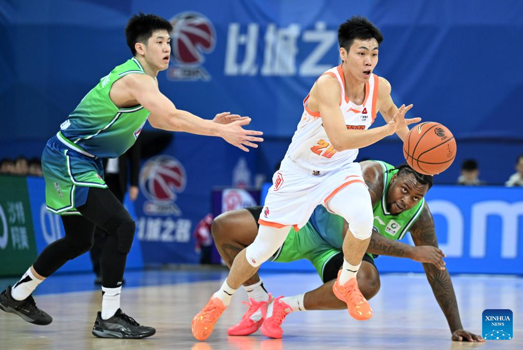 Pang Zhenglin (2nd R) of Jiangsu Dragons breaks through during a match between Tianjin Pioneers and Jiangsu Dragons at the 2025-2026 season of the Chinese Basketball Association (CBA) league in Tianjin, north China, Dec. 23, 2025. (Xinhua/Zhao Zishuo)
