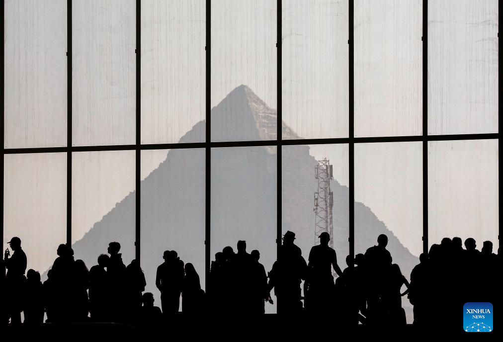This photo shows a distant view of the Egyptian pyramid as seen from inside the Grand Egyptian Museum in the Greater Cairo, Egypt, Dec. 23, 2025. (Xinhua/Ahmed Gomaa)