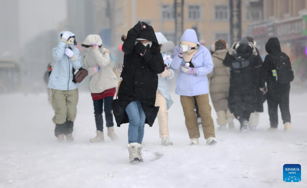 People walk on a street in snow in Harbin, northeast China's Heilongjiang Province, Dec. 23, 2025. The meteorological observatory of Harbin issued a yellow alert for blizzard on Tuesday. (Photo by Zhang Shu/Xinhua)