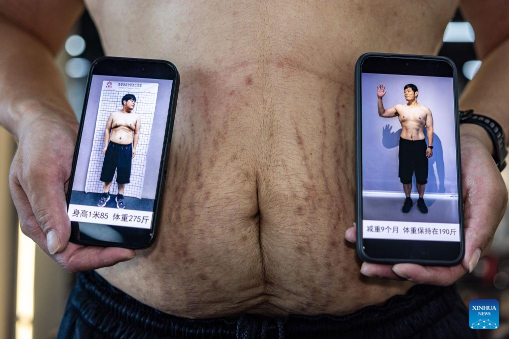 A man shows two photos of himself in which the one who loses weight farewells the over-weighted one at a fitness center in Huzhou City, east China's Zhejiang Province, Nov. 5, 2025.