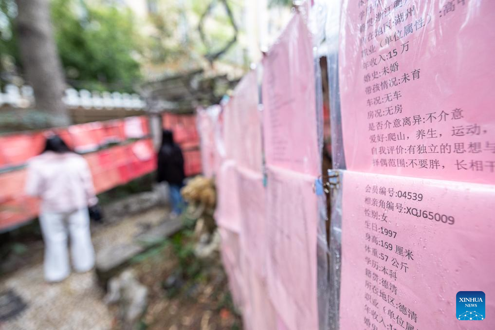 A dating post with weight requirement is hung at a matchmaking corner in Huzhou City, east China's Zhejiang Province, March 28, 2025.