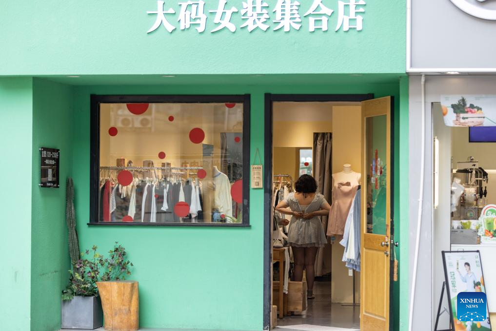 A woman tries clothes at a plus-size clothing shop in Huzhou City, east China's Zhejiang Province, April 1, 2025.