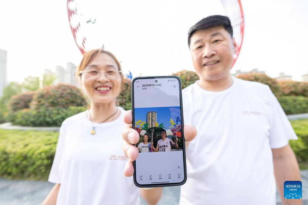 A couple shows a photo recording their efforts in weight management in September of 2023 on a cellphone at Waizhuang Park in Huzhou City, east China's Zhejiang Province, April 14, 2025. They admitted they all had completed the task of losing 15 kilograms of weight after two years of exercises.
