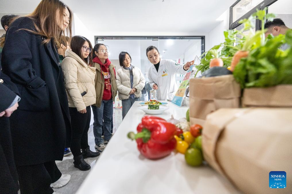 A dietitian introduces the knowledge on BMI and balanced diet to people at a community in Huzhou City, east China's Zhejiang Province, March 18, 2025. Free consultation in the community gains popularity among citizens.