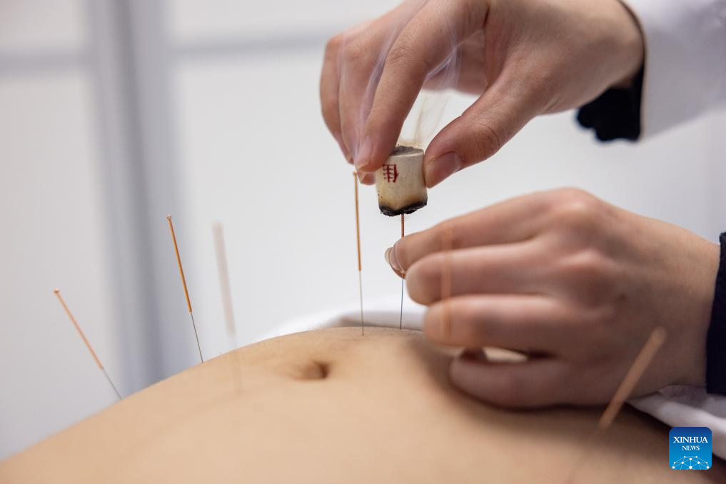 A resident receives acupuncture treatment at a traditional Chinese medical hospital in Huzhou City, east China's Zhejiang Province, March 21, 2025.
