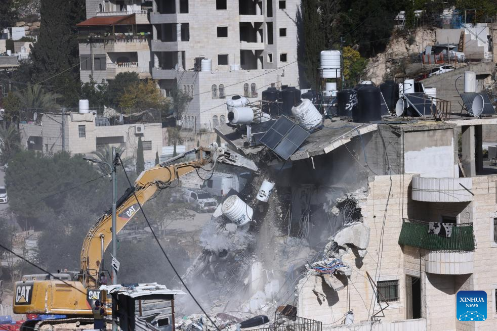 An excavator demolishes a residential building in the Silwan neighborhood of east Jerusalem, on Dec. 22, 2025. Israeli forces on Monday demolished a four-floor residential building in Silwan, a Palestinian neighborhood in east Jerusalem. The apartment building, home to about 90 Palestinian residents living in 13 residential units, was the largest residential structure demolished in the area this year, according to Israeli rights group Ir Amim. (Photo by Jamal Awad/Xinhua)
