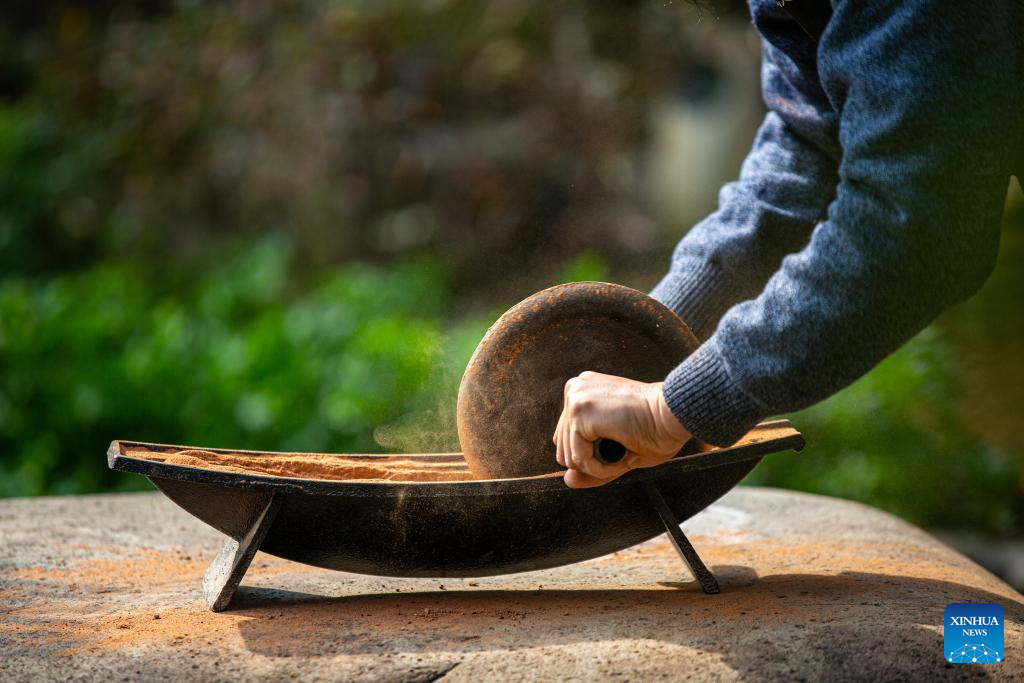 An artist grinds rock and soil into powder in Wuyishan City, southeast China's Fujian Province, Dec. 19, 2025. Wuyishan boasts a wide range of colorful rock and soil, which serve as a natural palette for painting, giving rise to the distinctive Wuyi rock pigment art. Integrating modern artistic elements and techniques into tradition, Wuyi rock pigment painting is gradually becoming a unique cultural feature of Wuyishan. (Photo by Chen Ying/Xinhua)