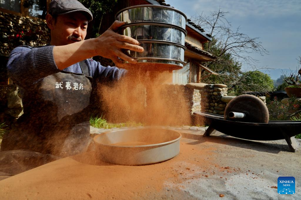 An artist sieves rock and soil powder in Wuyishan City, southeast China's Fujian Province, Dec. 19, 2025. Wuyishan boasts a wide range of colorful rock and soil, which serve as a natural palette for painting, giving rise to the distinctive Wuyi rock pigment art. Integrating modern artistic elements and techniques into tradition, Wuyi rock pigment painting is gradually becoming a unique cultural feature of Wuyishan. (Photo by Chen Ying/Xinhua)