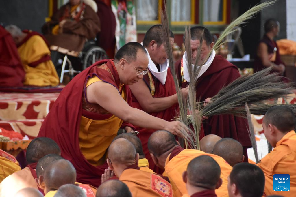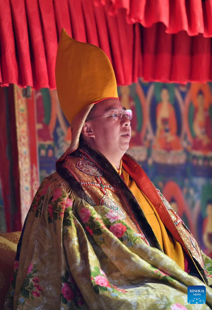 Panchen Erdeni Chos-kyi rGyal-po, a member of the Standing Committee of the National Committee of the Chinese People's Political Consultative Conference, vice president of the Buddhist Association of China and president of the Xizang branch of the Buddhist Association of China, attends a gathering to commemorate the 30th anniversary of the enthronement of Panchen Rinpoche at Tashilhunpo Monastery, in Xigaze City, southwest China's Xizang Autonomous Region, Dec. 9, 2025. (Photo by Chogo/Xinhua)