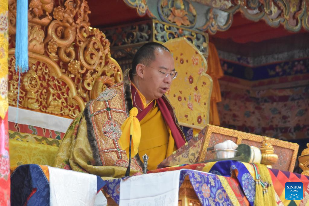 Panchen Erdeni Chos-kyi rGyal-po, a member of the Standing Committee of the National Committee of the Chinese People's Political Consultative Conference, vice president of the Buddhist Association of China and president of the Xizang branch of the Buddhist Association of China, attends the Kalachakra (wheel of time) ritual at Tashilhunpo Monastery, in Xigaze City, southwest China's Xizang Autonomous Region, Oct. 11, 2025. (Xinhua/Dronla)