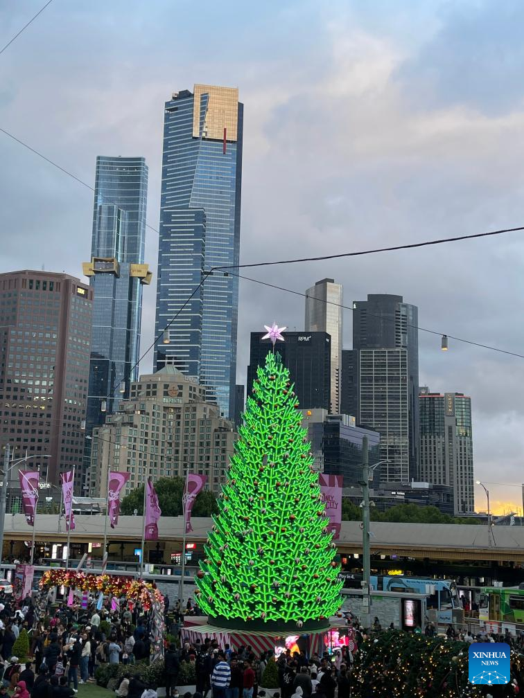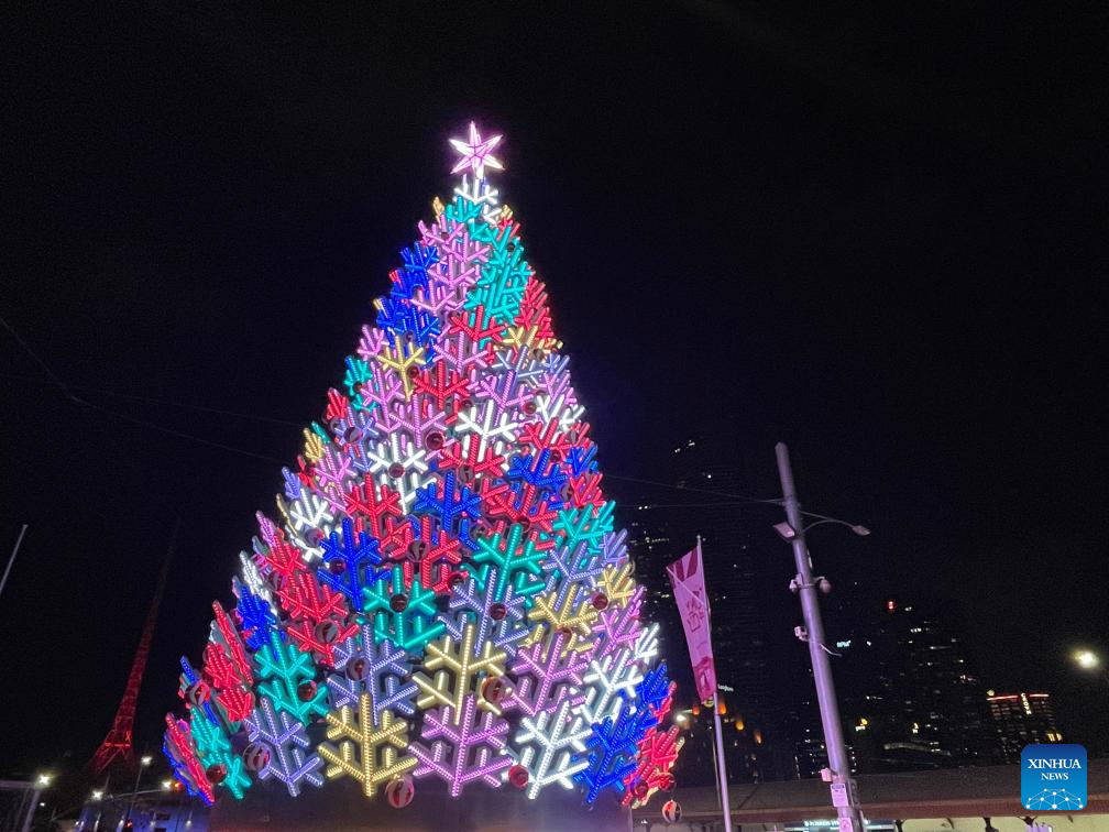 This photo taken with a mobile phone shows a Christmas tree adorned with festive lights at Federation Square in Melbourne, Australia on Dec. 25, 2025. (Xinhua/Xu Haijing)