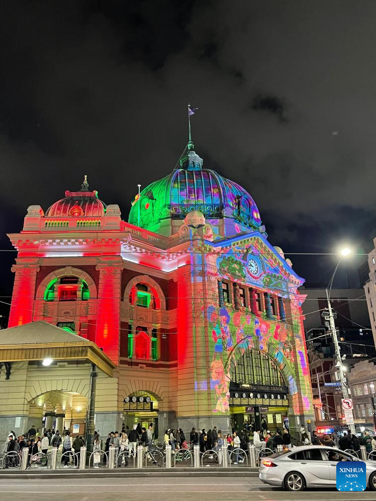 This photo taken with a mobile phone shows the Flinders Railway Station lit up with festive lights to celebrate Christmas in Melbourne, Australia, Dec. 25, 2025. (Xinhua/Xu Haijing)