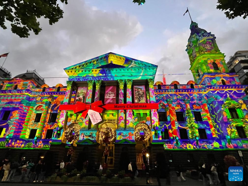 This photo taken with a mobile phone shows the Melbourne Town Hall lit up with festive lights to celebrate Christmas in Melbourne, Australia, Dec. 25, 2025. (Xinhua/Xu Haijing)