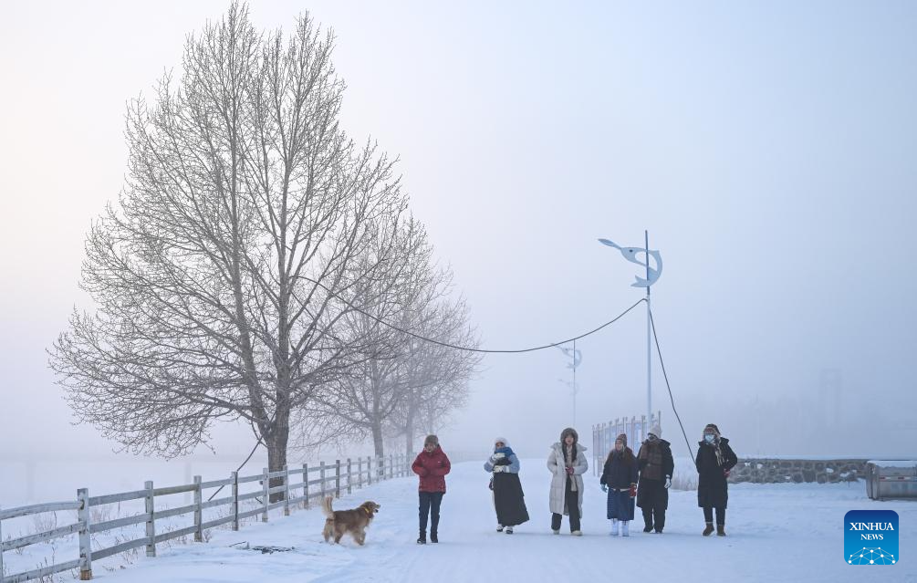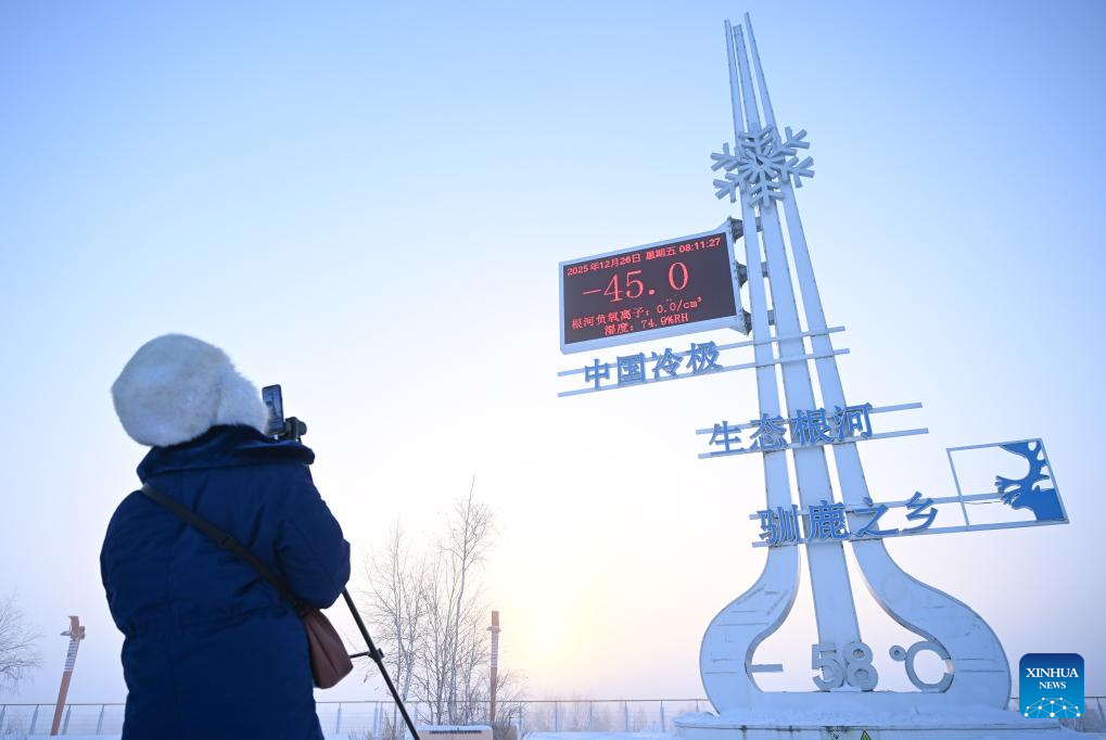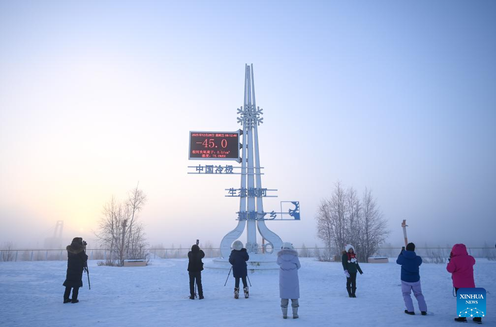 Tourists visit Genhe City, north China's Inner Mongolia Autonomous Region, on Dec. 26, 2025. The low temperature in Genhe, known as "China's cold pole," hits minus 45 degrees Celsius on Friday morning. (Xinhua/Bei He)