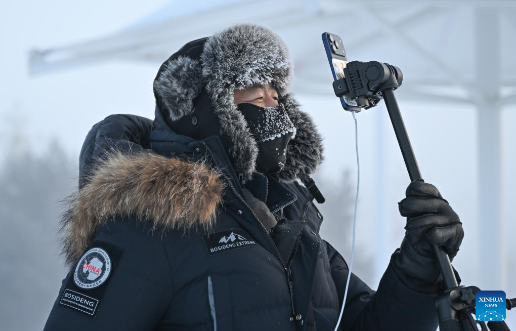 A video blogger does livestream in Genhe City, north China's Inner Mongolia Autonomous Region, on Dec. 26, 2025. The low temperature in Genhe, known as "China's cold pole," hits minus 45 degrees Celsius on Friday morning. (Xinhua/Bei He)