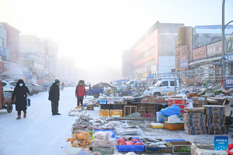 Citizens select products at a morning market in Genhe City, north China's Inner Mongolia Autonomous Region, on Dec. 26, 2025. The low temperature in Genhe, known as "China's cold pole," hits minus 45 degrees Celsius on Friday morning. (Xinhua/Bei He)